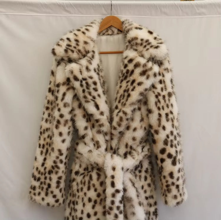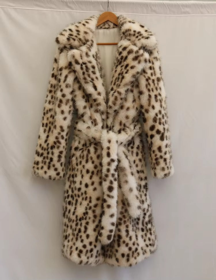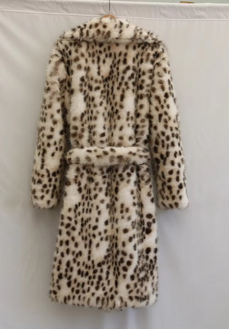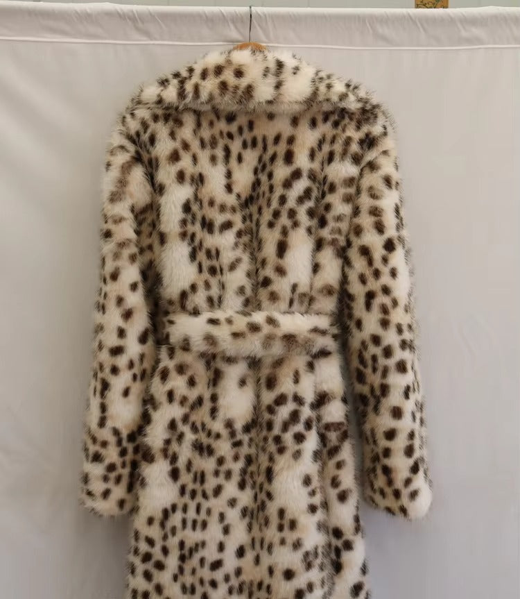 • Luxury long faux fur coat with bold leopard mink-style pattern