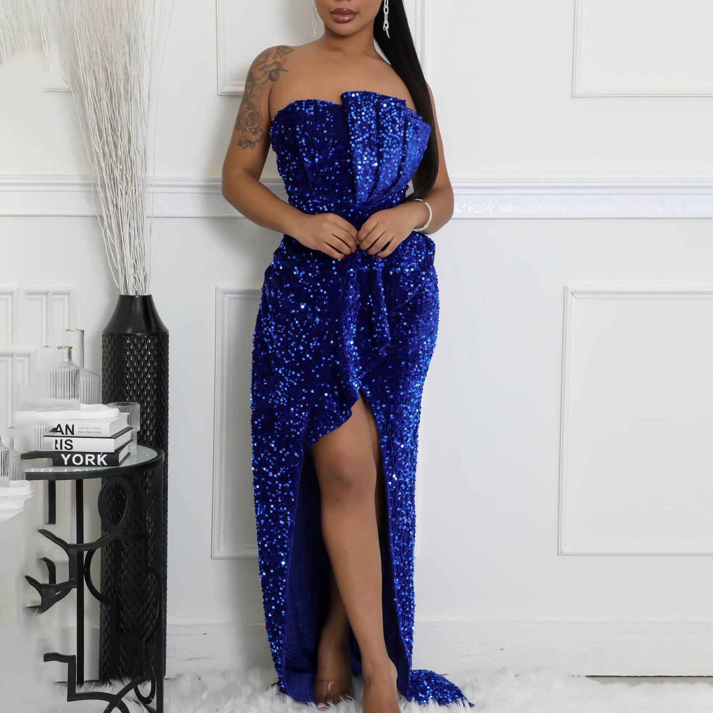 Modest Sequin Evening Maxi Dress Strapless Backless Sleeveless Party Gown