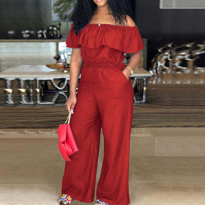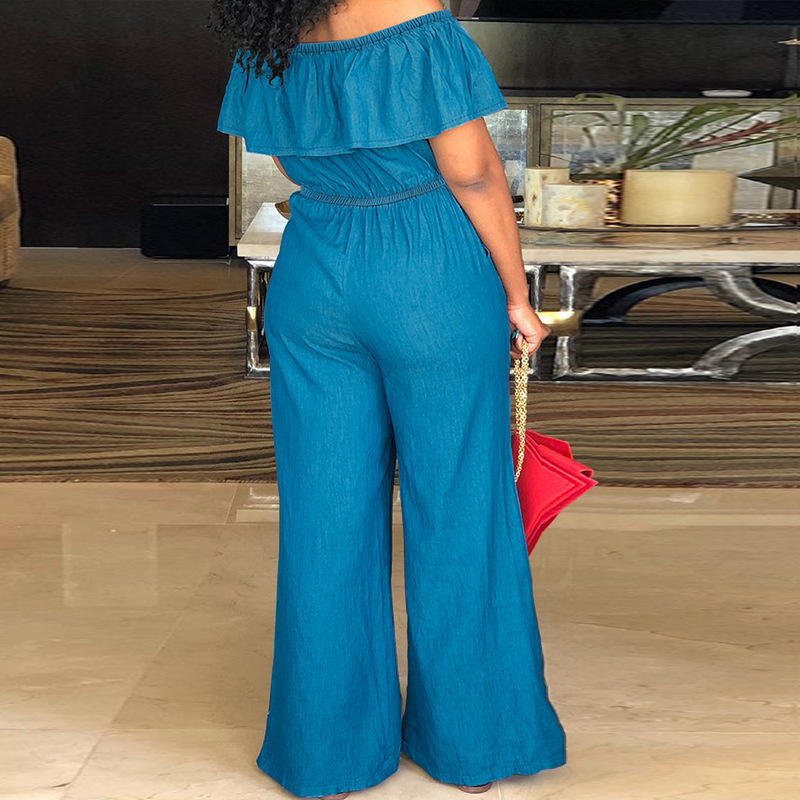 Plus Size Off Shoulder Denim Jumpsuit Ruffle One Piece Jeans for Women