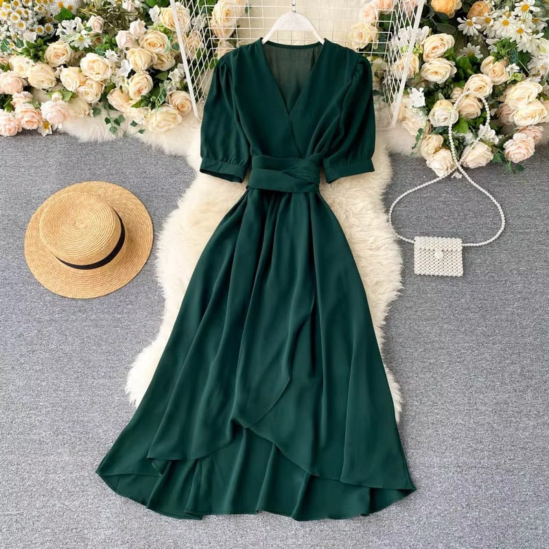 Summer Solid Color V Neck High Waist Puff Sleeve Ruffle Dress