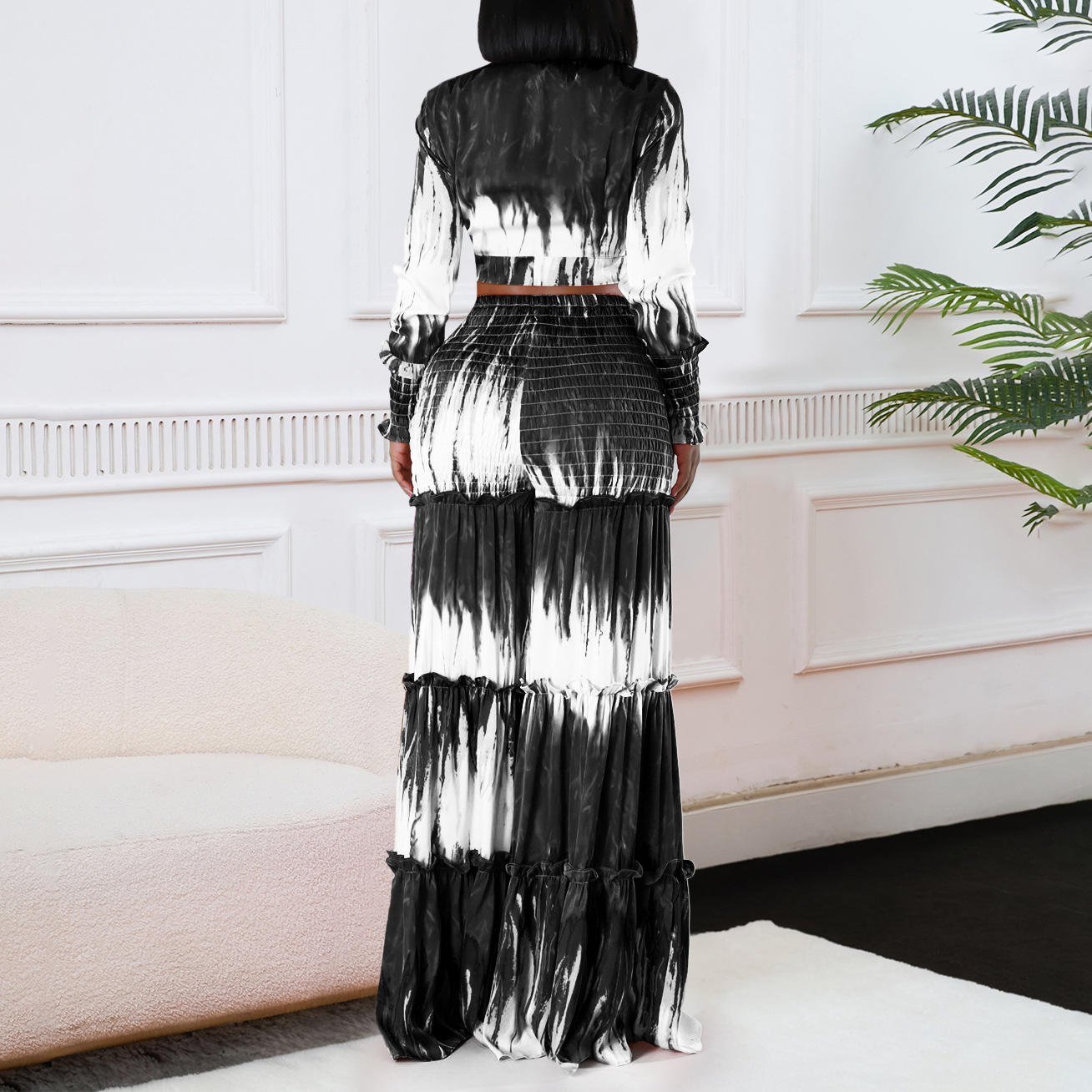 Trendy Printed Two Piece Set for Women Long Sleeve Top Wide Leg Pants