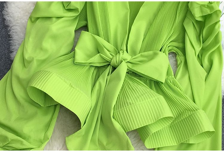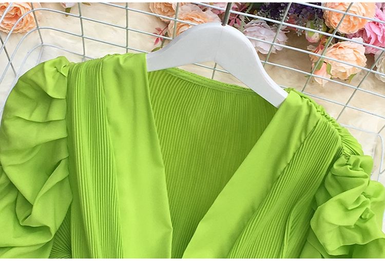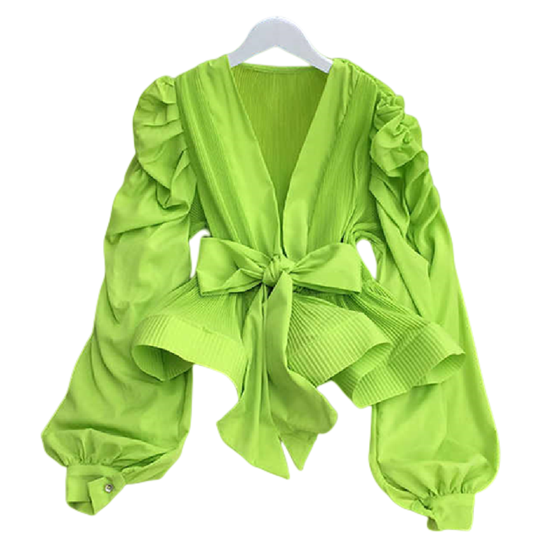 V Neck Puff Sleeve Pleated Blouse for Women Ruffle Lace Up Waist