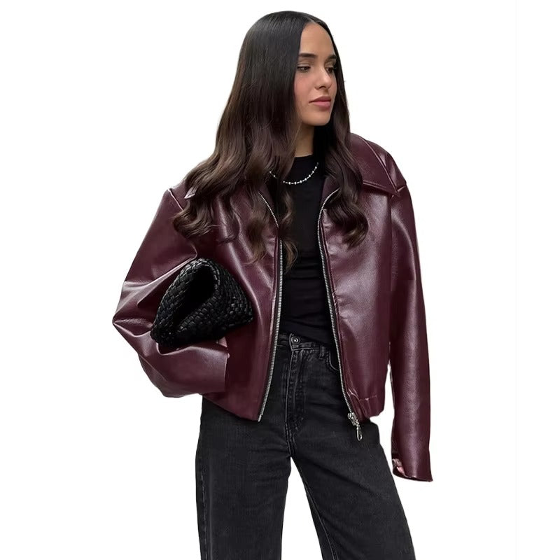 Vintage PU Leather Zipper Jacket for Women Retro Long Sleeve Coat