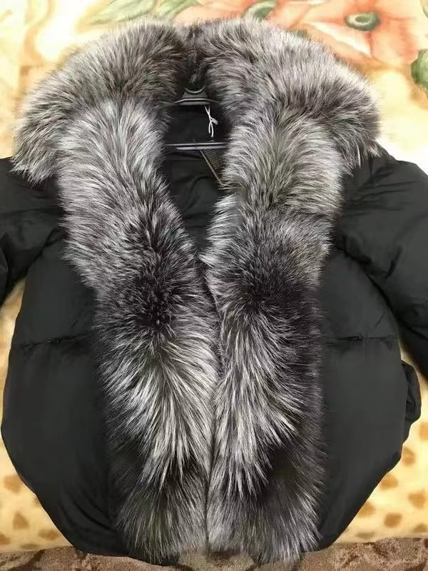 • Real fox fur collar adding a rich, elegant finish