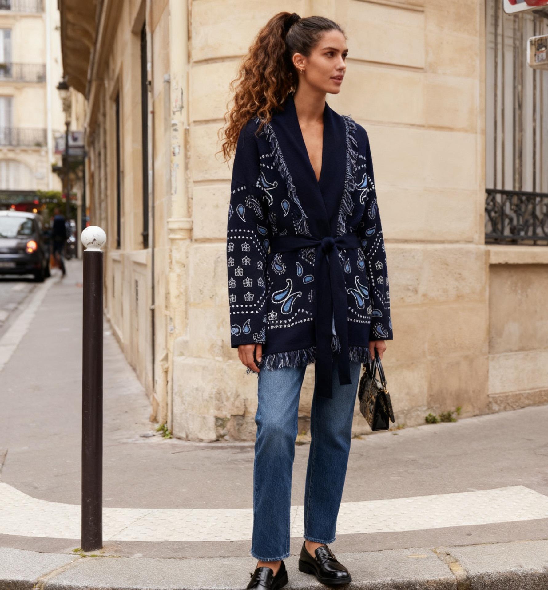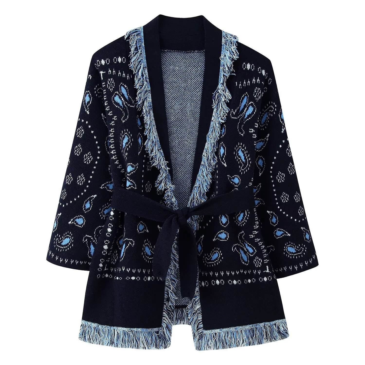 Women’s Winter Jacquard Lace-Up Lapel Tassel Cardigan Coat Jacket