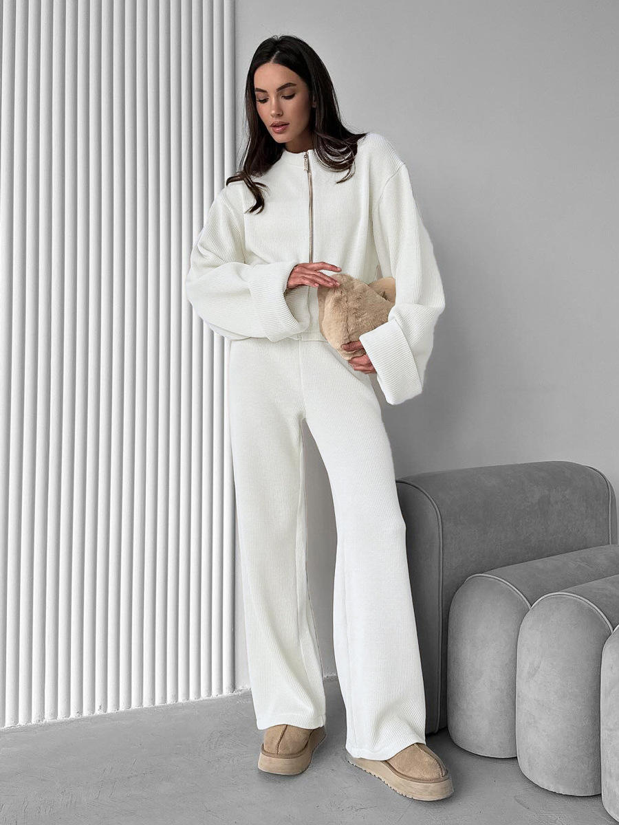 Women's Autumn Winter Two Piece Knitted Zipper Jacket and Wide Leg Pants Loose Fit Sweater Set