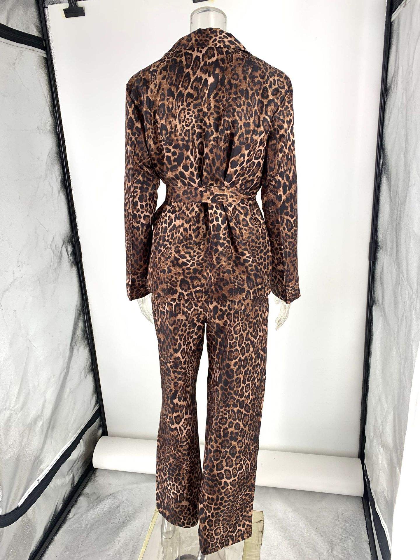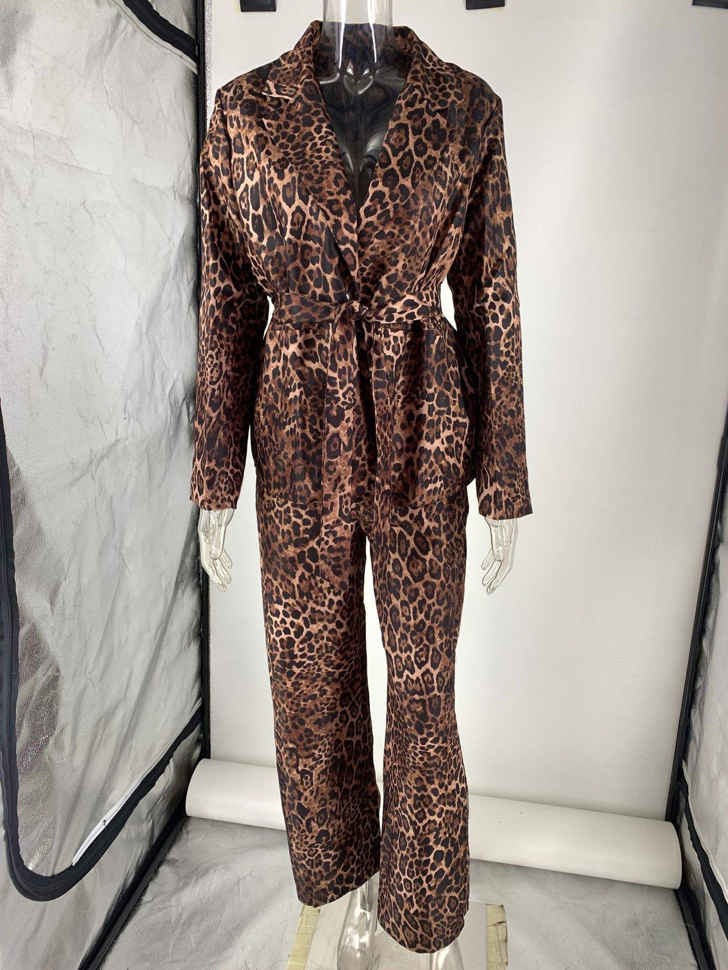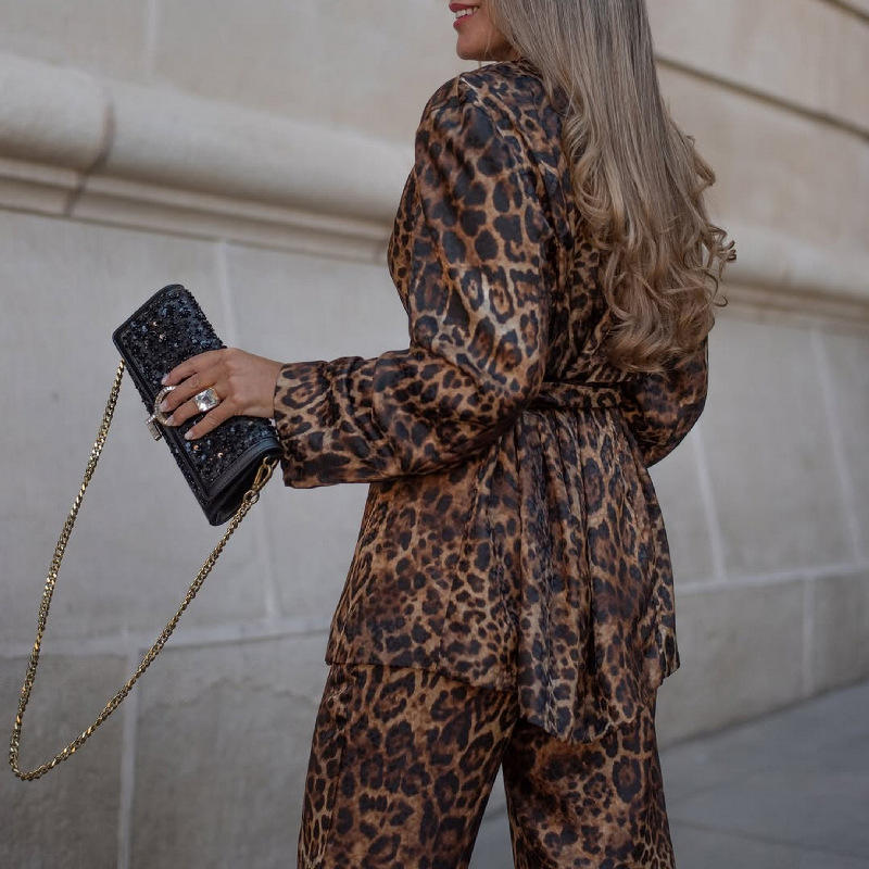 Women's Leopard Lapel Blazer and Wide Leg Pants Autumn Winter Office Suit